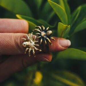 Esta colección nace de la forma simple y perfecta de la margarita, una flor que simboliza nuevos comienzos y claridad. Cada pieza, bañada en oro, transforma lo efímero de una flor en un objeto que permanece.